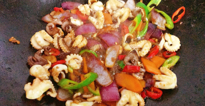 5、下入八爪鱼翻炒几下,加入圆葱。