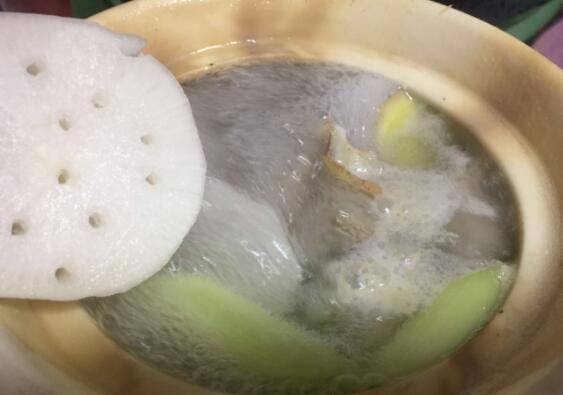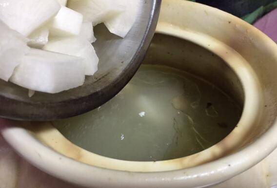 7、放入萝卜片中大火煮开20分钟,然后转小火慢炖50分钟左右。