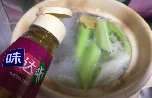 6、将焯好水的羊排倒入开了水的汤煲内,加葱、姜味达美臻品料酒煮开。