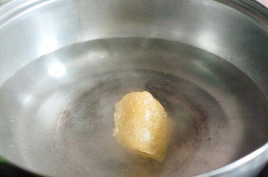 3、取一个洁净无油的锅,水开后放冰糖,待其全部融化后放入剥好的橘子。
