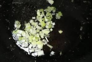 5、留底油将葱花炒出香味,加入调好的酱汁煸炒至水分蒸发。