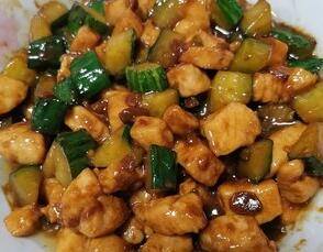 6、加入鸡丁、黄瓜丁翻版均匀即可。