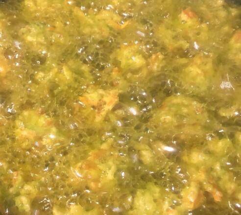 放食用油,油温七成热下锅炸。炸至金黄色即可捞出。 用大拇指与食指间的虎口挤出球形生面团丸子,直接下锅炸。