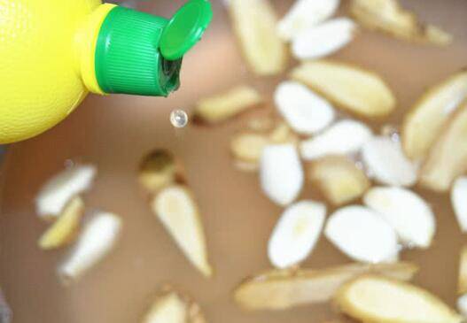 将大蒜瓣去皮,生姜洗净,切片待用,将称好的白糖倒入面盆中,再加入一瓶(500ml)白醋。