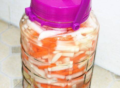 将白、红萝卜和调料汁水一起装进事先洗干净的玻璃罐中;将玻璃罐盖子盖好,然后放在阴凉的地方,腌5-7天左右,就入味了。期间可以把萝卜条翻两次,防止上面的萝卜条不够入味。
