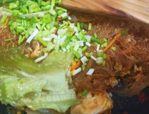 粉丝2包、青辣椒2个、小香葱3棵、生菜适量、豆瓣酱1勺、蚝油1勺、酱油1勺、盐适量、十三香小半勺。