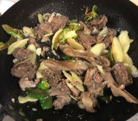 倒入鸭肉翻炒,加入青椒、紫苏。