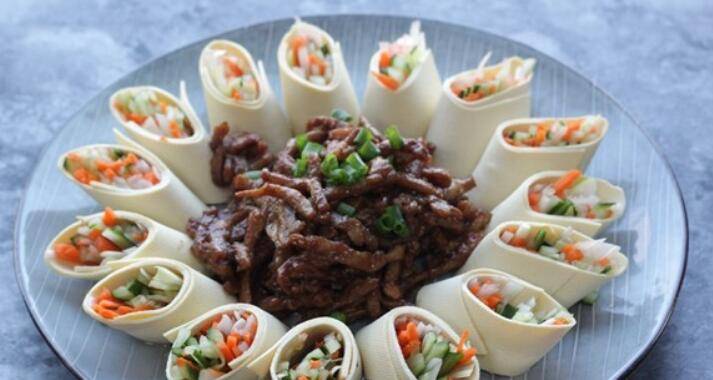 用料:瘦肉250克、大葱一根、胡萝卜半根、青瓜豆腐皮两张、盐适量、花生油适量、生抽5毫升、甜面酱10克、生粉5克、蚝油5克。