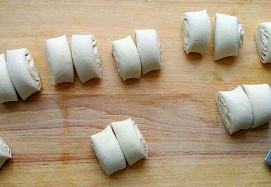 把面团擀开成大面皮,均匀地刷上一层椒盐油。卷起来,先等分切开成8段,每一段再等分切开。
