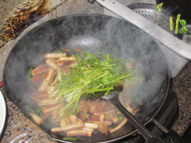 4、倒入鱿鱼,加适量料酒、生抽、香菜,大火翻炒。