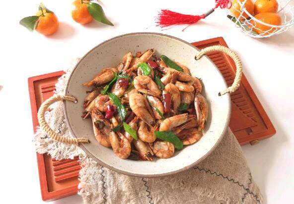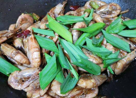 用料:北极甜虾400g、蒜苗1棵、生姜3片、干红辣椒5个、红烧酱油1勺、料酒1勺、盐适量、糖适量、醋少许、调和油适量。