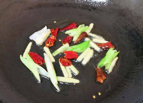 4、炒锅内倒适量的调和油烧热,下入蒜苗、姜丝和干红辣椒炒香。