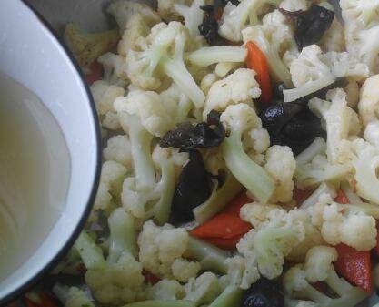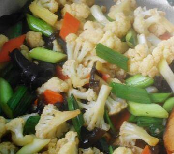 最佳答案用料:花菜1棵、胡萝卜50克、黑木耳5克、青蒜2棵、蒜2瓣、鸡汤少量、酱油1汤匙、水淀粉少量、盐适量、花生油适量。1、菜花切成小朵放淡盐水中浸泡10分后洗干净。2、木耳泡发后,清洗干净撕小朵。3、胡萝卜削皮后切菱形片;青蒜切段;蒜拍碎。4、锅中烧开水,放入菜花稍焯烫捞出沥水。5、炒锅中加入...