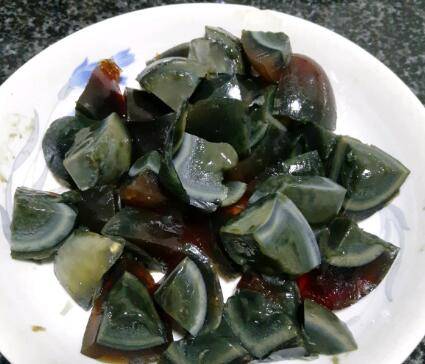 蒜头切碎,辣椒切碎备用。皮蛋剥壳,用刀或者线切成小块。