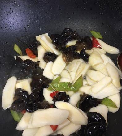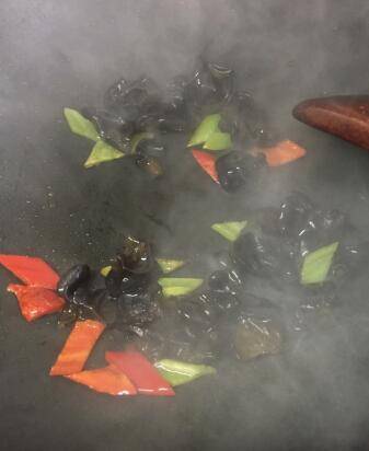 2、锅内烧滚放油,炒青红椒和木耳。