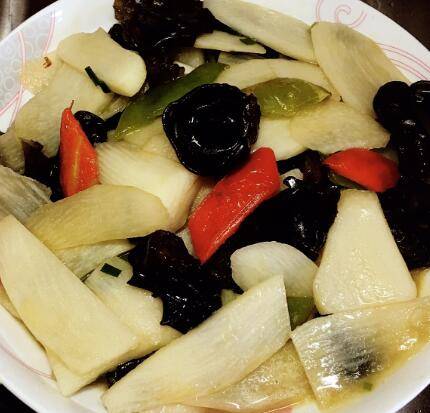 淮山200g、盐少许、木耳50g、青红椒少许、蚝油一小勺、葱适量。