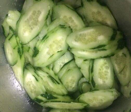 1、黄瓜切薄片撒入适量的盐,把盆端起来颠匀,静置3-5分钟。