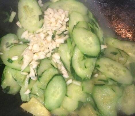 2、热锅入油,加姜片香葱爆香,倒入黄瓜片,翻炒三四十秒。
