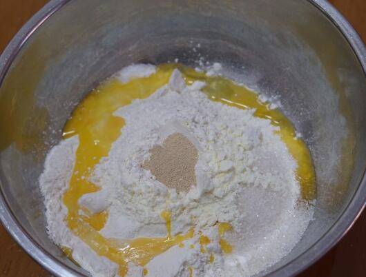 1、在大盆中倒入高筋面粉、低筋面粉、鸡蛋、白砂糖、酵母、奶粉、盐搅拌均匀。