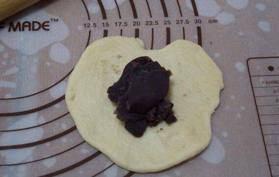 8、提前将豆沙也是分成六小份,把小面团用擀成圆形,放入豆沙。