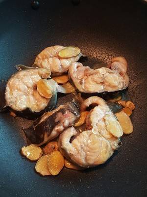 4、翻炒几下,待姜片微变色便可放入腌好的鱼块,中途翻面一次。