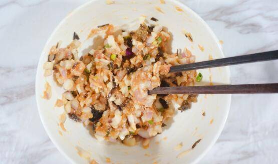 5、将香葱放入肉馅中搅拌。