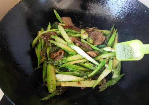 5、肉片翻炒几分钟,放入葱花继续翻炒,再放入切好的芦笋翻炒,加入花椒粉、盐翻炒两下加入蔬菜鸡精关火。