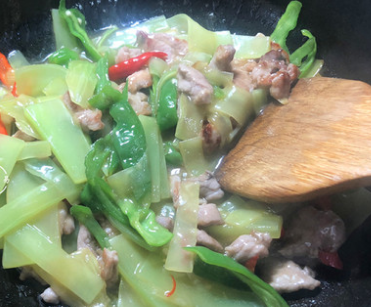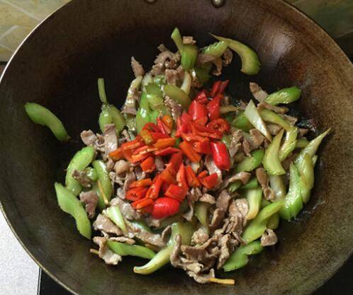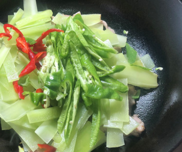 5、将莴笋片和辣椒一同倒入锅中,大火翻炒至莴笋软化。