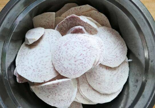 2、芋头切薄片装盆备用。