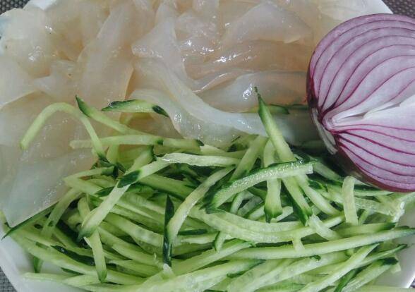 黄瓜两根、拉皮一袋、蒜几瓣、醋两勺、生抽一勺、糖半勺、香油一勺、葱。