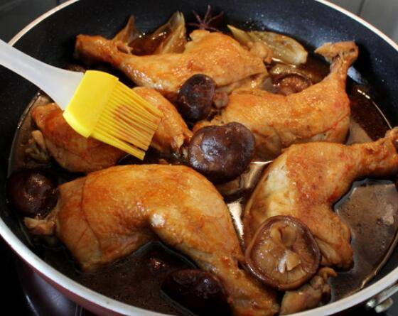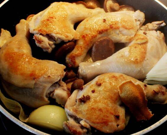 准备食材:鸡腿、香菇、老卤、洋葱、八角、生姜、桔皮、花椒、老抽、蚝油、白糖、盐、植物油。