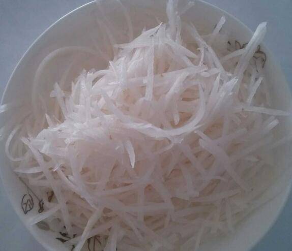 锅中放油烧热,入花椒、葱花、爆香,放入白萝卜丝,翻炒,放盐、清水,加点醋,即可出锅。