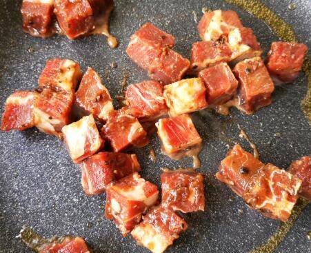 锅中留适量底油,放入腌制好的牛肉粒,大火爆炒2-3分钟,大火能快速封锁住牛肉粒里面的肉汁,让牛肉吃起来口感软嫩多汁。