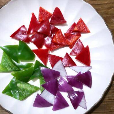 牛肉粒500克、红彩椒1个、青椒1个、洋葱半个、牛排酱约30克、橄榄油适量。