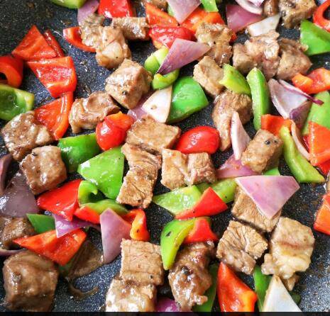 然后加入炒过的彩椒和洋葱继续大火翻炒均匀即可。