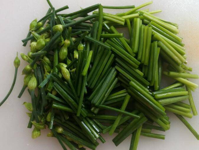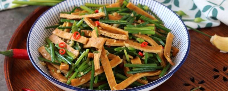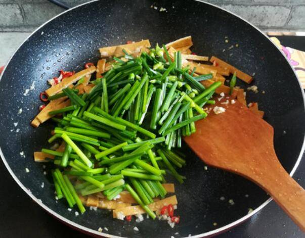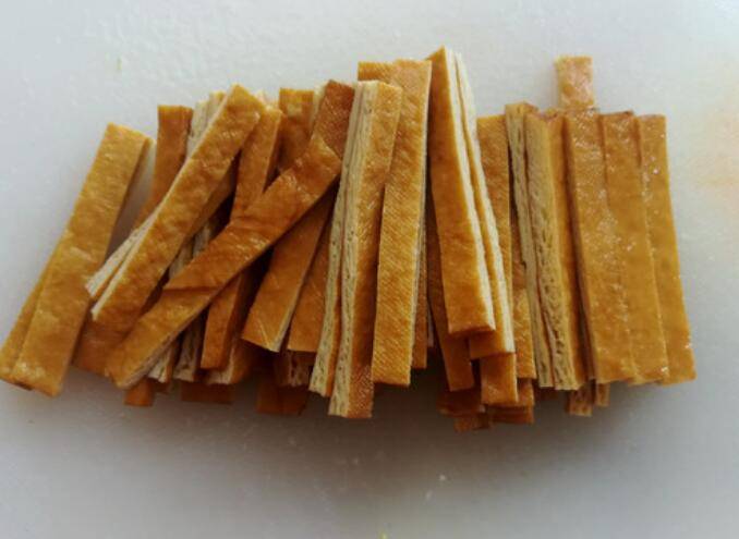 1.准备好一小把韭菜花和3块五香豆腐干。