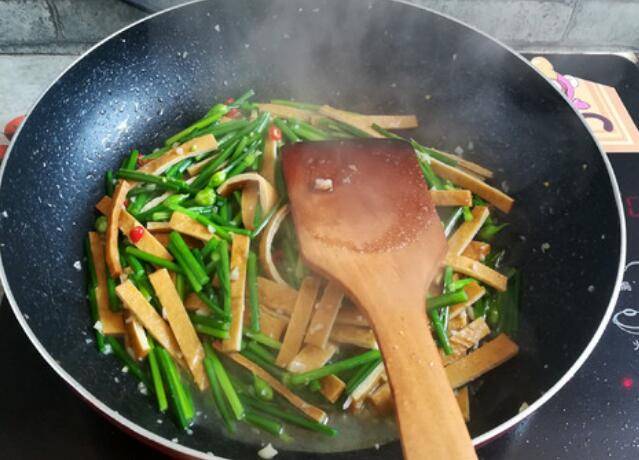 用料:韭菜花一小把、五香豆腐干3块、蒜米2瓣、辣椒2个、生抽适量、食用油10克、盐2克。