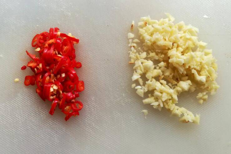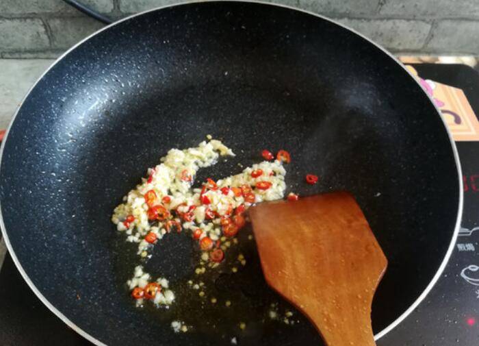 5.热锅冷油,放入蒜泥,辣椒煸出香味。