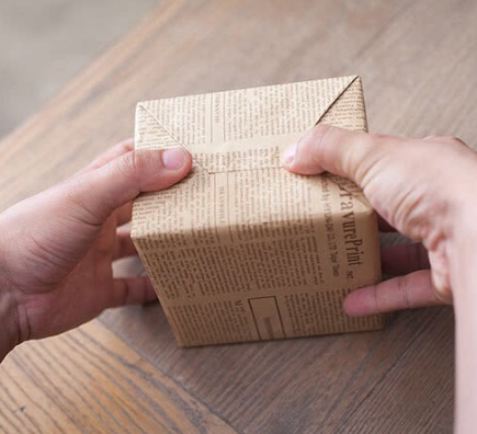 2、将右侧的纸沿盒子向内折入,保持纸的边缘位于盒子中央,再把左侧的纸向内折入,前后的纸也用同样的方法折叠。