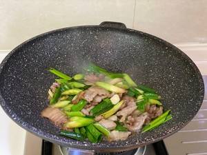 用料:五花肉、生蚝、蒜苗、盐、生抽、姜丝、蒜苗。