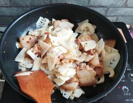 11、再加入15克油,五花肉翻炒到肉片边缘有轻微焦黄。