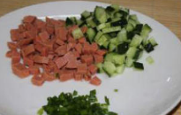 米饭适量、青瓜适量、火腿肠适量、土鸡蛋适量、盐适量、黑椒粉。