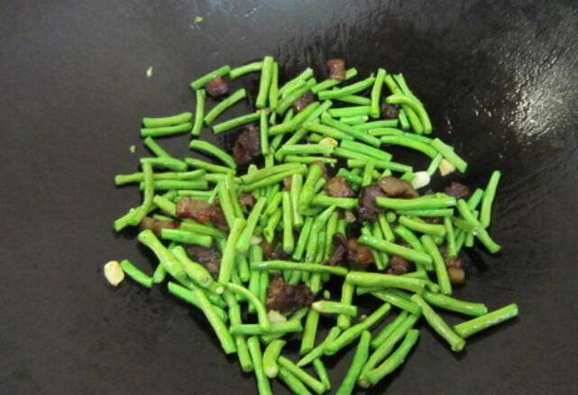 用料:豇豆200克、腊肉100克、红尖椒1个、植物油2汤匙、食盐2克、生抽1茶匙、蒜2瓣。