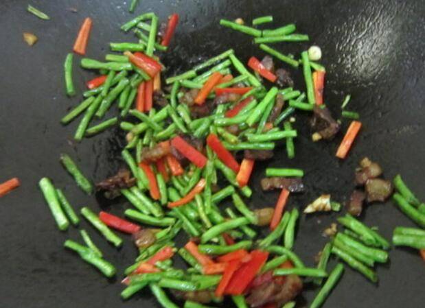 6.豇豆表面炒至起皱时加入尖椒翻炒。