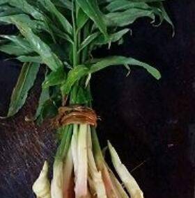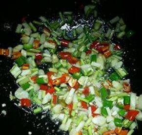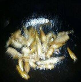 用料:小干鱼15个左右、嫩姜叶一把、鲜红绿线椒三根、大蒜二瓣、料酒、盐、鸡精、糖适量。