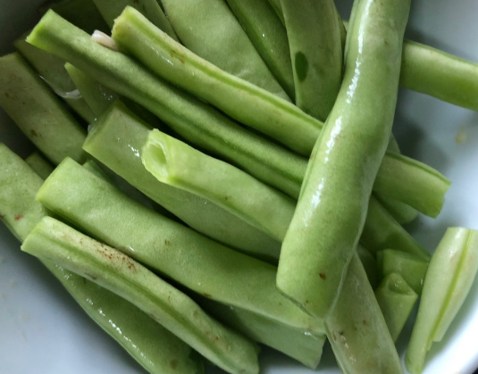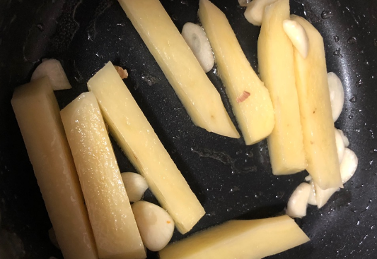 热锅冷油,下蒜瓣炒香后下土豆条炒至微微焦黄,下刀豆翻炒均匀。