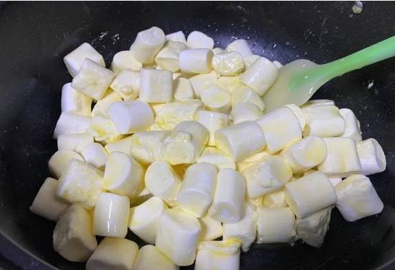 2、不粘锅中倒入黄油融化;黄油融化后倒入棉花糖继续搅拌。