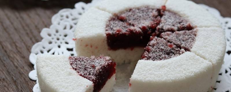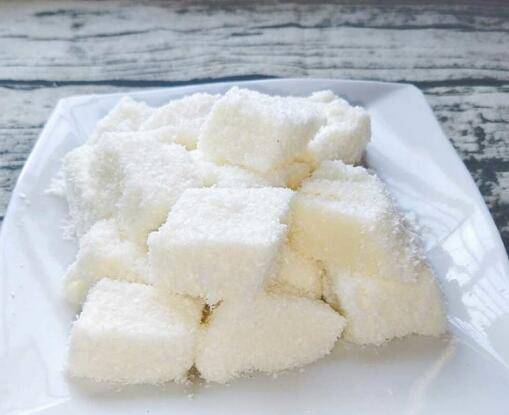 把凉透的雪花糕从冰箱内拿出来切块,块的大小依每个人的喜好,但是不宜过大。切好后裹椰蓉,装盘。