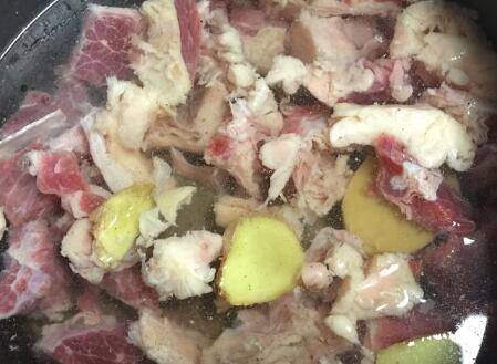 2、泡出的血水倒掉,高压锅加高汤和适量水,加入姜片和盐,压18分钟。