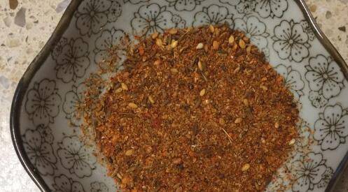 4、准备好喜欢的蘸料,辣椒面、孜然、糖、花椒粉、盐拌在一起的干料。